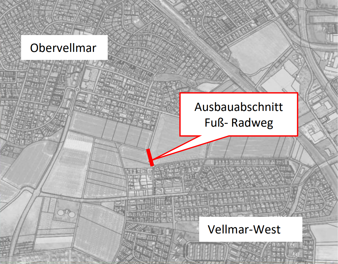 Lageplan_Ausbau_Fuß_Radweg Bürgermeister Manfred Ludewig zeigt sich sehr zufrieden mit dem Ergebnis: „Wir danken dem Landkreis Kassel für die Förderung dieses Projektes, das vielen Menschen ein verbessertes Angebot im Bereich der Nahmobilität schafft.“