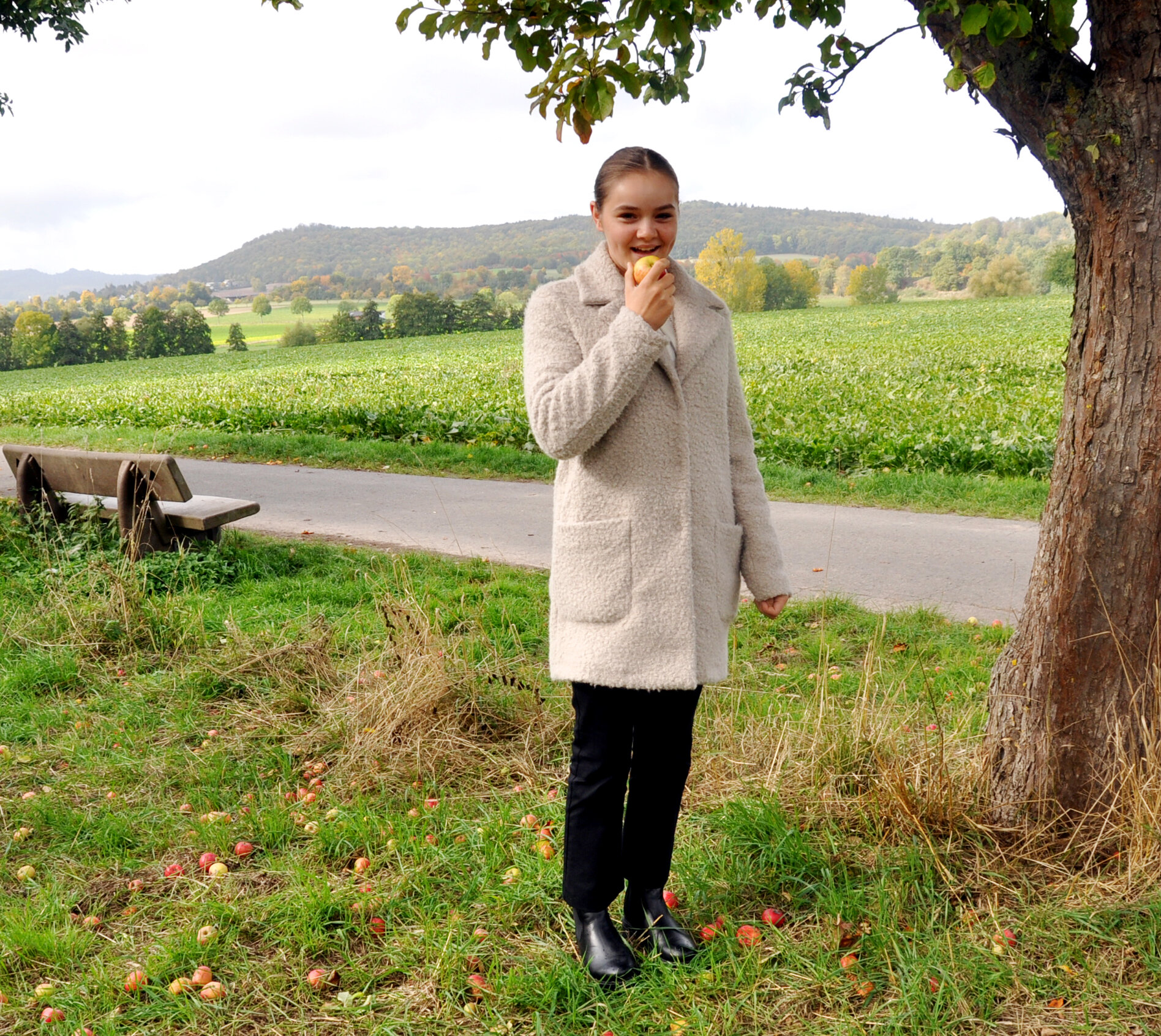 Foto: Bella Westphal, zur Zeit als Schulpraktikantin bei der Stadt Vellmar tätig, kann bestätigen, dass auch bereits heruntergefallene Äpfel noch richtig lecker schmecken können und dabei zu 100 % Bio sind.