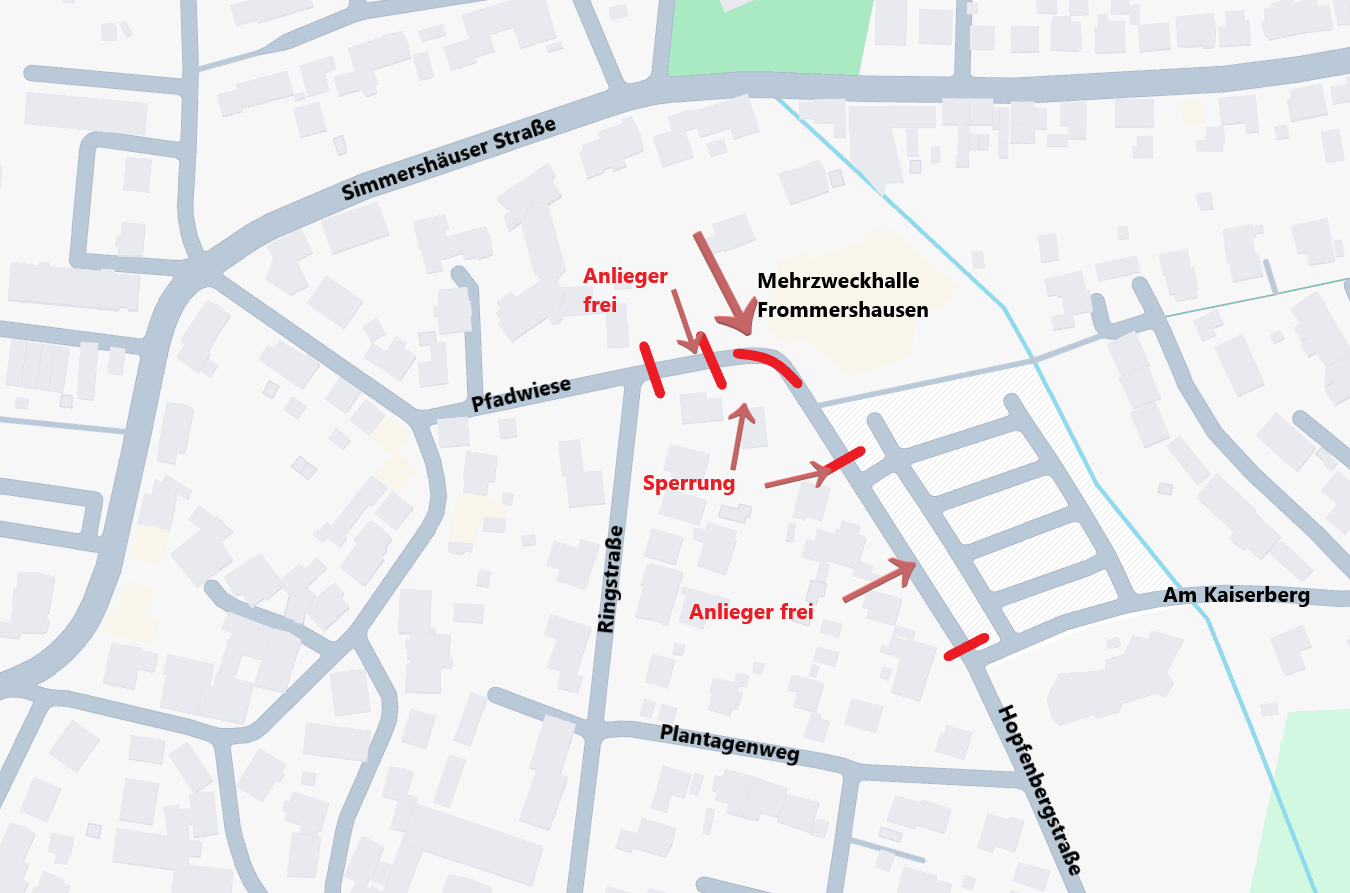 Die Pfadwiese im Stadtteil Frommershausen ist vom 6. bis 17. Oktober 2025 in Höhe der Hausnummern 9 bis 10 (Mehrzweckhalle) gesperrt. Die Nutzung der Parkplätze an der Mehrzweckhalle ist weiterhin möglich. Die Sperrung ist notwendig, da im Auftrag der Städtischen Werke Netz & Service Tiefbauarbeiten im Bereich der Wasserversorgung durchgeführt werden. Wir bitten um Verständnis für die Beeinträchtigungen.