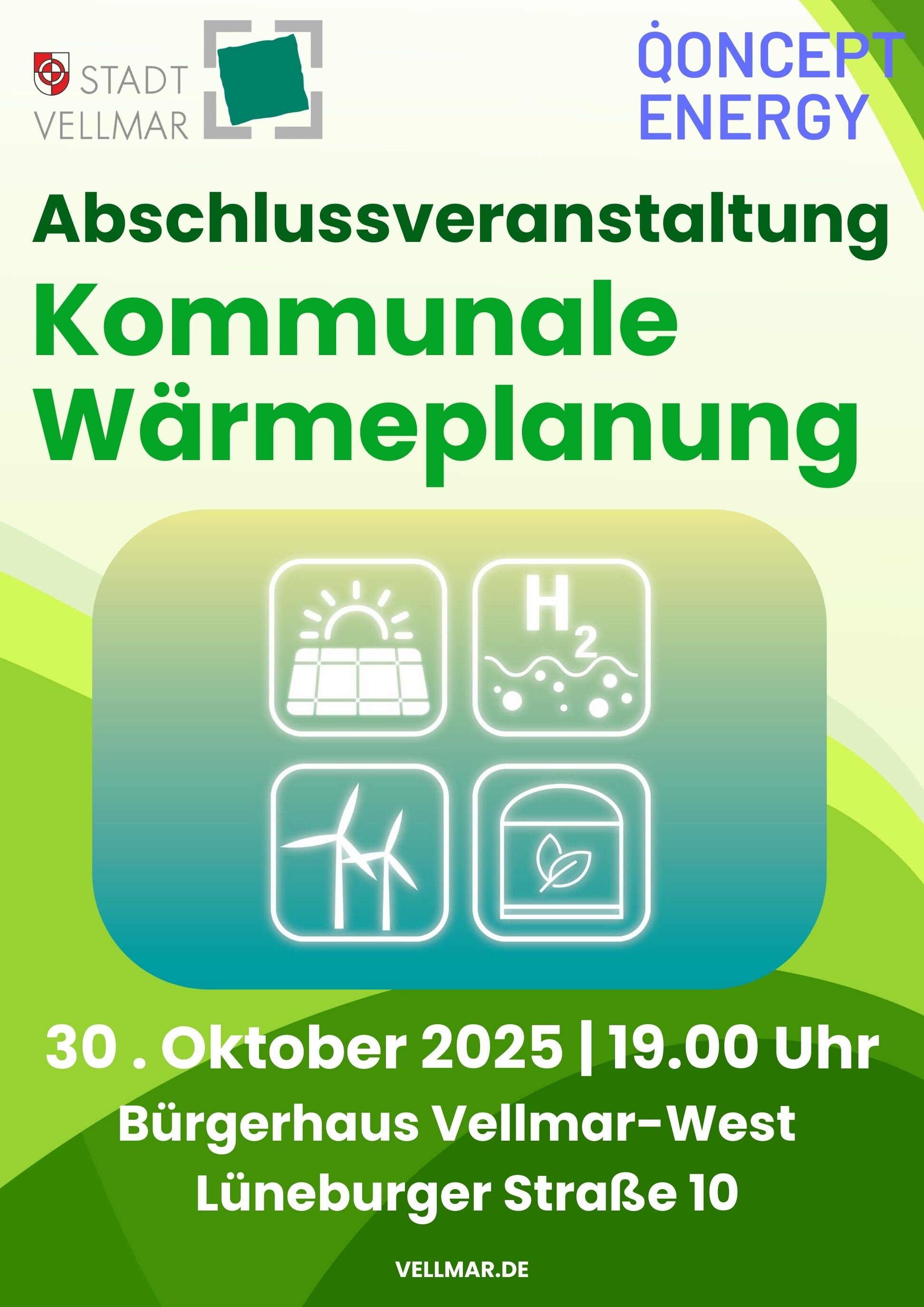 Am 30.Oktober 2025 werden im Bürgerhaus Vellmar-West die Ergebnisse der kommunalen Wärmeplanung vorgestellt. So können Sie sehen, ob ihr Haus möglicherweise an ein Fernwärmenetz in der Zukunft angeschlossen werden kann oder ob Sie sich selbst um eine Wärmeversorgung kümmern sollten.