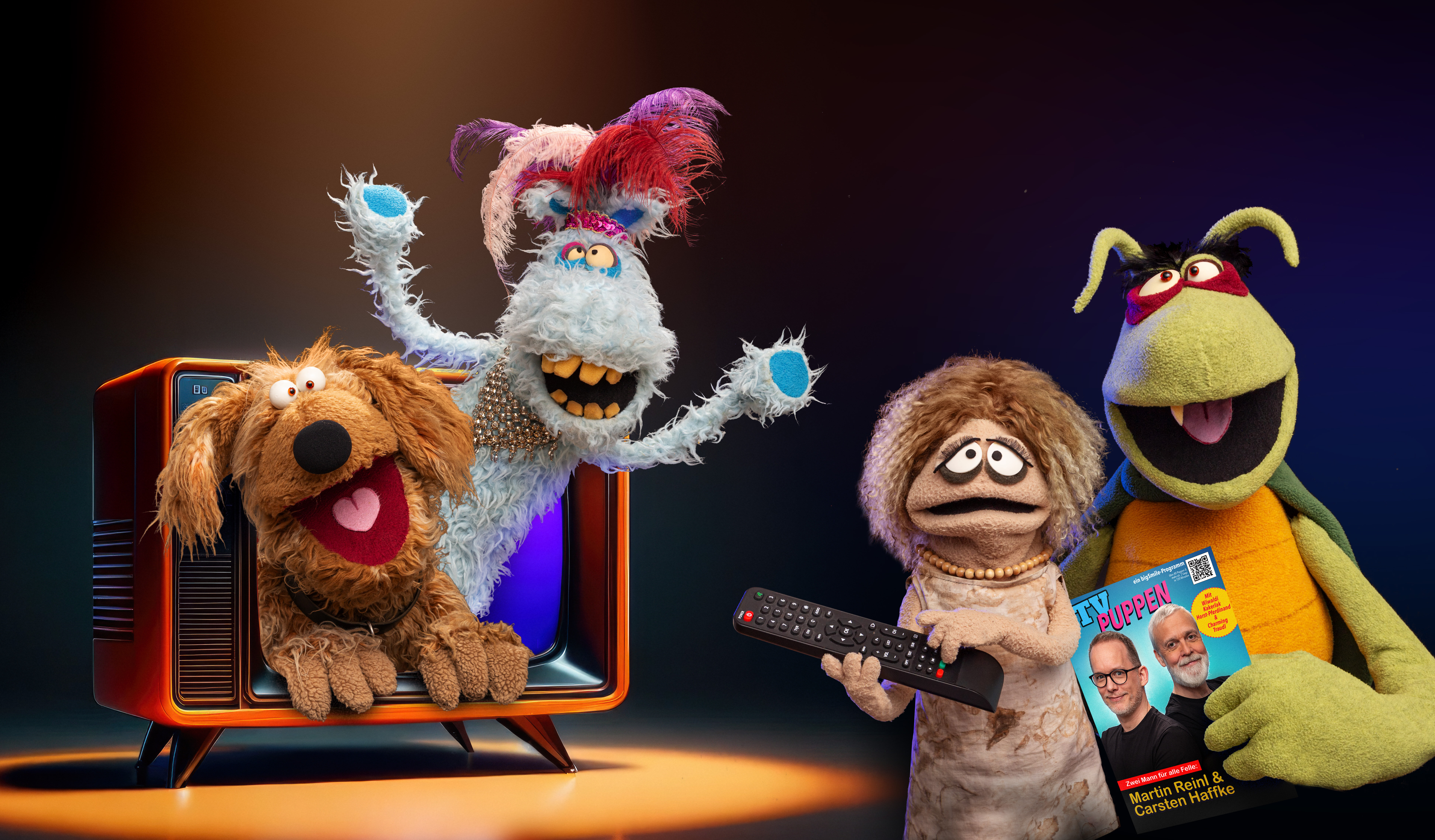Die Puppenspieler Martin Reinl & Carsten Haffke präsentieren in ihrer neuen Show eine unterhaltsame Zeitreise durch die Geschichte des Fernsehens! Nachgestellt und neu interpretiert mit einem Puppenensemble der Extraklasse. Die Stars aus der „Wiwaldi Show“, „Zimmer frei“ und den „RTL Puppenstars“ feiern mit Ihnen die größten TV-Momente aus 100 Jahren und verraten Geheimnisse, von denen selbst Hardcore-Nerds noch keine Ahnung hatten. Wussten Sie, dass das alte Zirkuspferd Horst-Pferdinand schon mal in einer Weltraumserie mitgespielt hat? Dass Wiwaldi & Kakerlak fast mal „Wetten dass…“ moderiert hätten? Und dass Charming Traudl sämtliche Fernsehmelodien nachnuscheln kann? Schwelgen Sie mit über 40 Puppen in nostalgischen Erinnerungen und werfen gleichzeitig auch einen Blick in die Zukunft. Vor Ihren Augen werden brandneue TV-Formate entwickelt und improvisiert. Egal ob flauschige Hamster, räudige Katzen oder verzottelte Monster: Martin Reinl & Carsten Haffke sind zwei Mann für alle Felle! Wenn Sie einen Abend erleben wollen, bei dem Sie endlich mal wieder herzhaft lachen können, dann kommen Sie Puppen gucken!